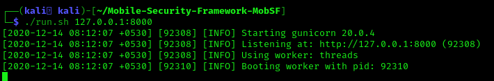 ./run.sh 127.0.0.1:8000And Mobile Security Framework will started on 127.0.0.1:8080 as we can see in the following screenshot: