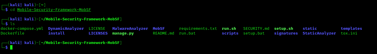 cd Mobile-Security-Framework-MobSFNow we can see the files by using ls command: